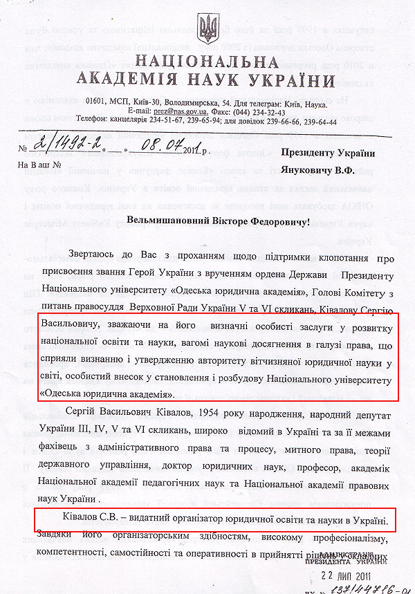 22 липня в адміністрацію президента надійшов ще один розлогий документ на підтримку Ківалова. На цей раз його автором виступила Академія наук.