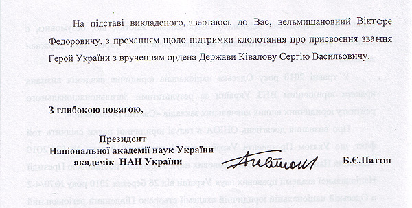 Крім того, на третій сторінці звернення академік Патон хвалить фахівців академії Ківалова тими ж словами, що і губернатор Матвійчук.