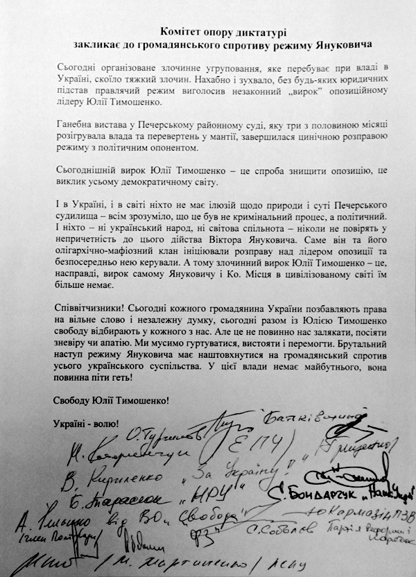 Протягом всього процесу було очевидним: в Україні немає жодної сили чи жодного авторитету, якій міг би стати реальною загрозою владі у захисті Юлії Тимошенко. Цією силою не стала ані власна політична партія Тимошенко, ані Комітет опору диктатурі, ані сам народ. Фактично вся дистанція – від першого виклику Тимошенко у Генпрокуратуру до дня оголошення вироку - пройшла у очікуванні зовнішньої реакції на події в Україні.
