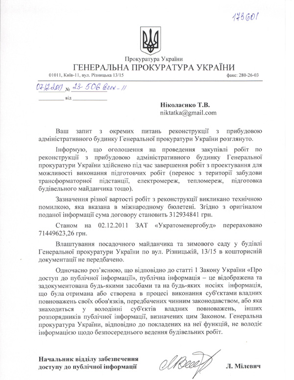 Ще за півтора місяці до укладання угоди з проектувальником "Укратаоменергобуд", 15 квітня 2011 року оголошено закупівлю "Реконструкція з прибудовою адміністративного будинку Генеральної прокуратури України по вул. Різницькій, 13/15 у Печерському районі Києва".