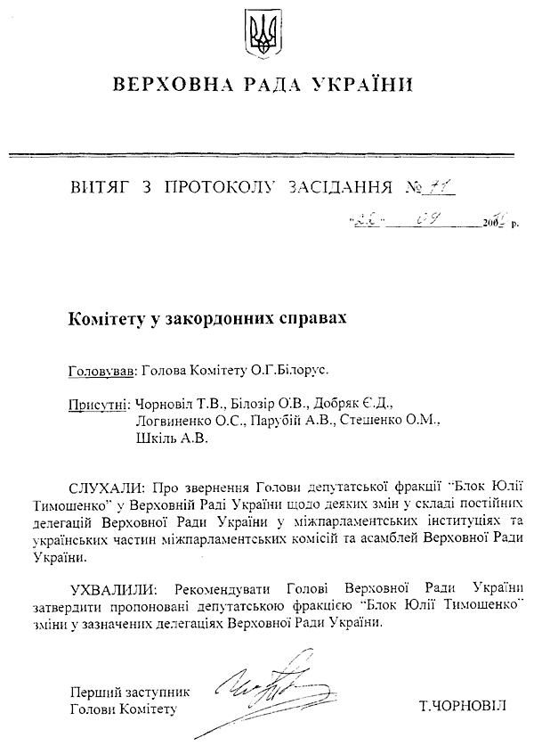 В письме также указано, что оппозиция неоднократно обращалась к главе Верховной Рады Владимиру Литвину с требованием изменить состав делегации. Но, несмотря на соответствующую резолюцию парламентского комитета по иностранным делам, Литвин по неизвестным причинам не предпринял никаких действий.