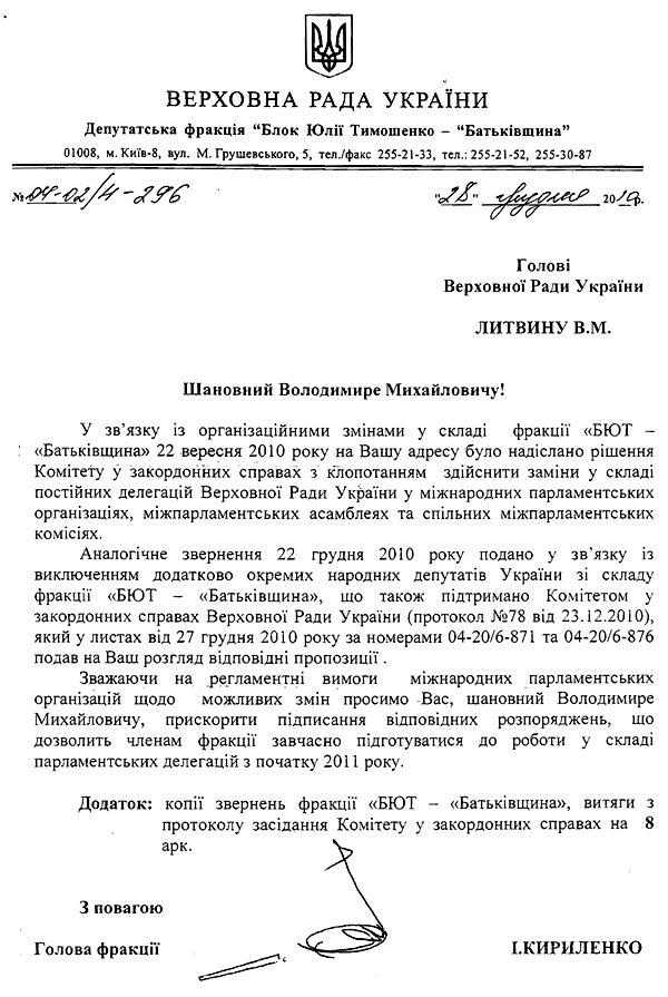 "Украинская правда" обратилась к руководству БЮТ с требованием предоставить подобные письма, если таковые были. К моменту публикации этого материала редакция получила текст письма бывшего руководителя фракции БЮТ Ивана Кириленко на имя Владимира Литвина с просьбой внести изменения в составе украинской делегации в ПАСЕ.
