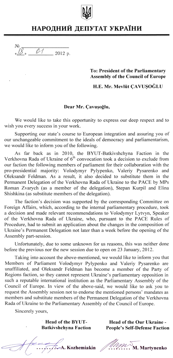В распоряжении "Украинской правды" оказалась копия письма, положившего начало скандалу. Письмо направлено 18 января 2012 года на имя резидента ПАСЕ Мевлута Чавушоглу и подписано лидерами фракции БЮТ Андреем Кожемякиным и НУНС Николаем Мартыненко.