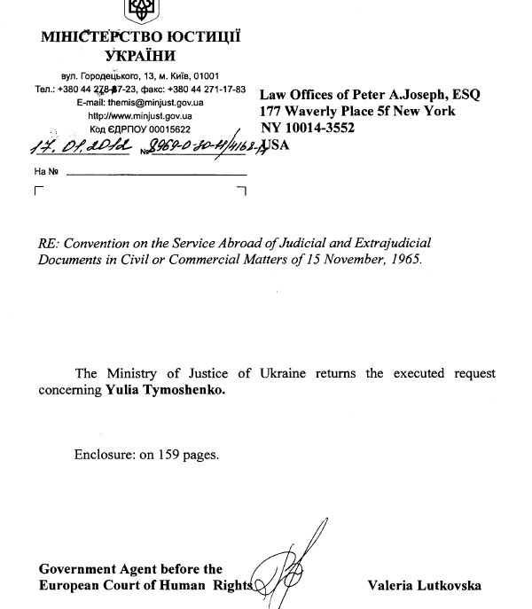 І, зрештою, 7 лютого клерк Окружного суду Північного округу Нью-Йорку видав свідоцтво про те, що копія повістки та позову були надані Юлії Тимошенко у відповідності до Гаазької конвенції від 1965 року, надавши як докази лист Мінюсту, Акт співробітників СІЗО та легітимаційне рішення Шевченківського суду.