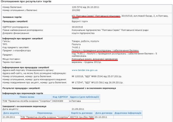 Показовим стала закупівля комунальним підприємством Полтавської міськради "Полтава-сервіс" послуг з охорони п'яти полтавських ринків. За результатами тендеру, який завершився в жовтні минулого року, переможцем було обрано ТОВ "Приватна служба охорони "Скорпіон".