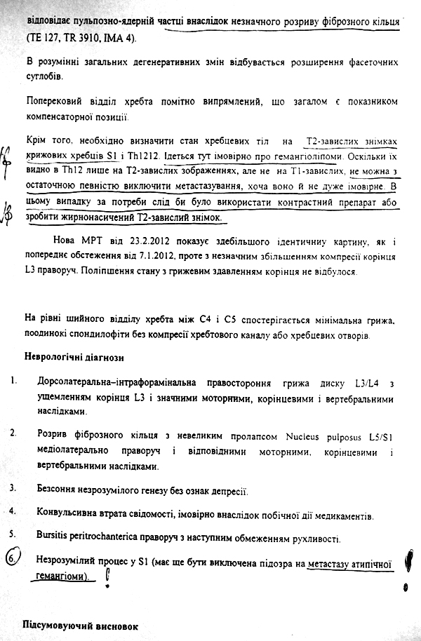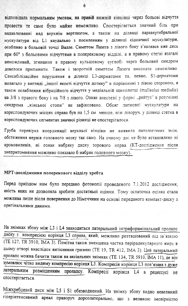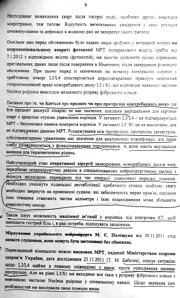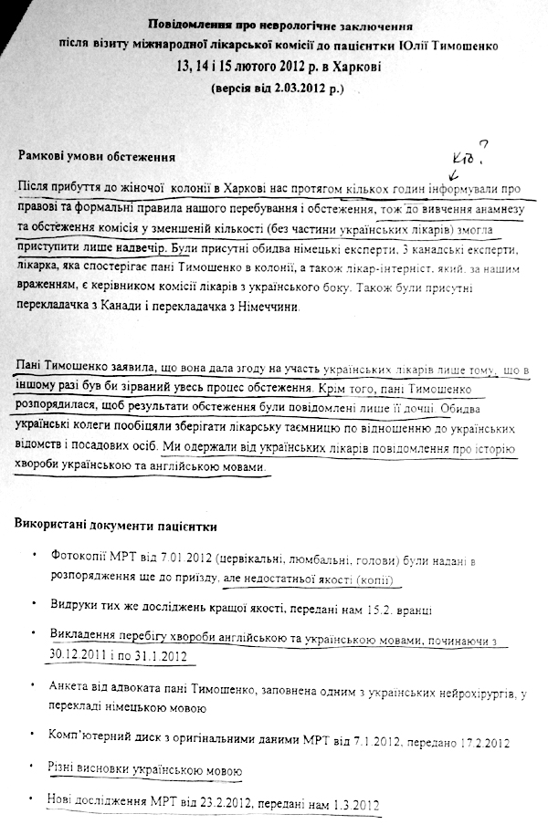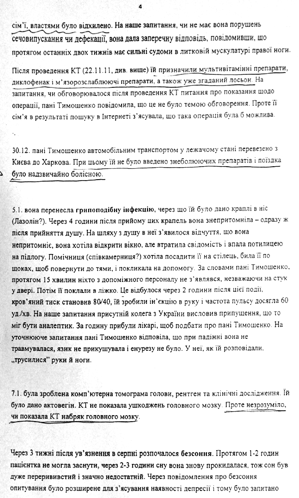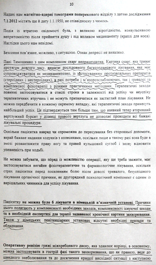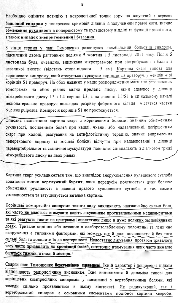 У висновку наголошується, що Тимошенко відчуває біль з вересня 2011 року, що обмежило її рухливість.