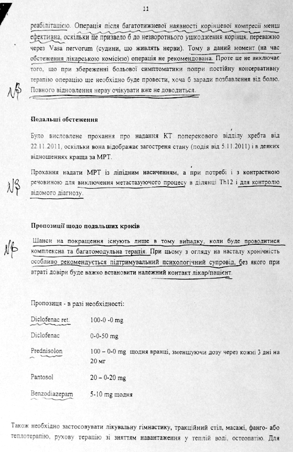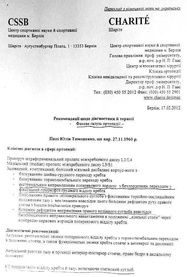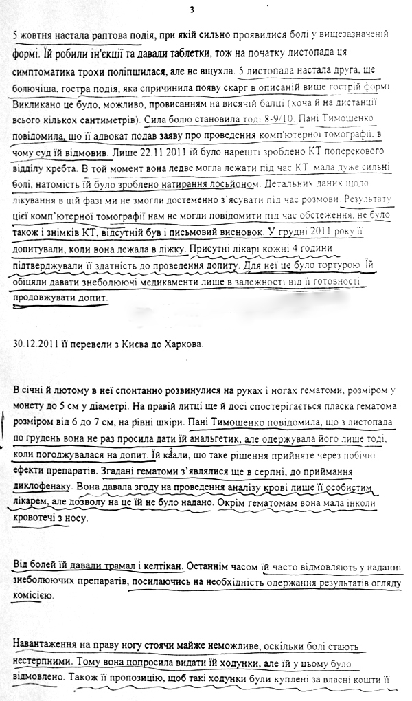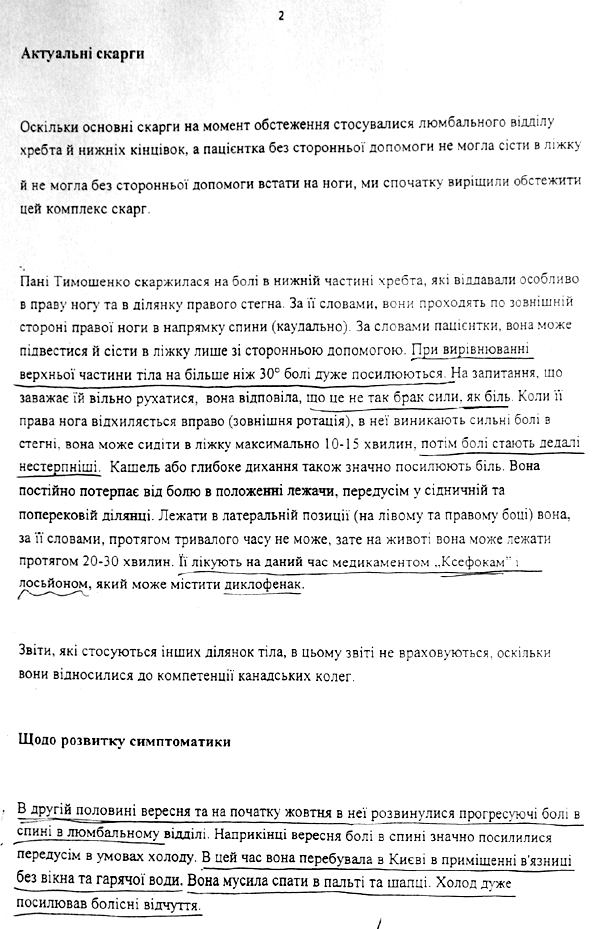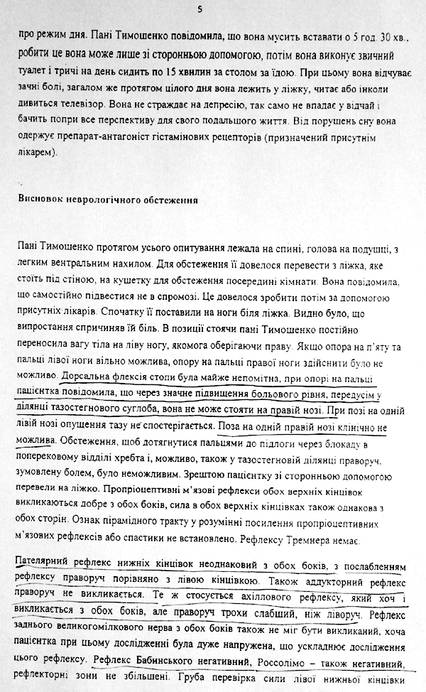 Як сказано у висновку вона може сидіти у ліжку максимально 10-15 хвилин, потім болі стають нестерпними. Тимошенко не може лежати на боці. При глибокому диханні і кашлі біль посилюється.
