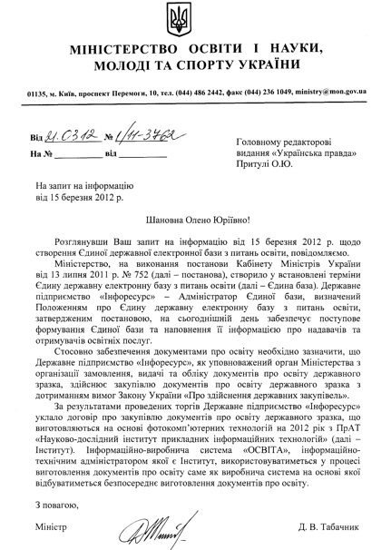 Відповідь міністра освіти на доручення Азарова була насичена зовсім іншими емоціями. Читаючи сухі рядки, фізично відчуваєш задоволення автора. Наприклад: "Власником засобів ІВС "Освіта"... є Науково-дослідний інститут прикладних інформаційних технологій Кібернетичного центру Національної академії наук України. Слід зазначити, що… була створена юридична особа майже з аналогічною назвою ЗАТ "Науково-дослідний інститут прикладних інформаційних технологій", про що добре відомо одному з її засновників академіку Згуровському М.З."