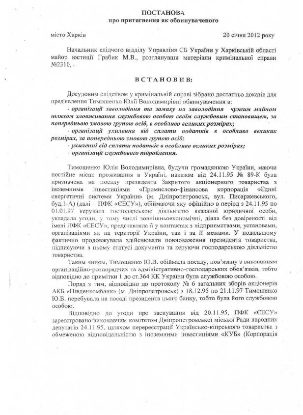 Постанова про притягнення як обвинувачення Тимошенко www.pravda.com.ua 20 квітня 2012, 13:02 Реклама: Шановні читачі, просимо дотримуватись Правил коментування