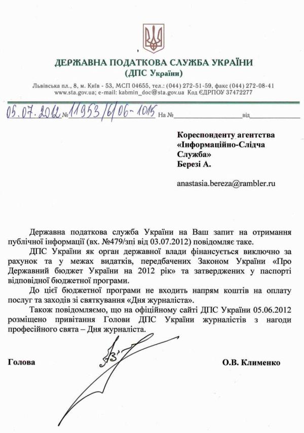 Отримана відповідь дещо спантеличила, оскільки податкова взагалі заперечила будь-яке офіційне проведення свята: "ДПС України фінансується виключно за рахунок та в межах видатків передбачених законом "Про держбюджет на 2012-й рік" та затверджених у паспорті бюджетної програми. До цієї бюджетної програми не входить напрям коштів на оплату послуг та заходів зі святкування "Дня журналіста".