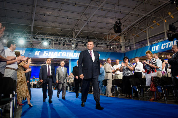 Нарешті, заграли фанфари - і до величезної зали виставкового центру зайшли Янукович і Азаров. Їх супроводжував натовп охоронців.