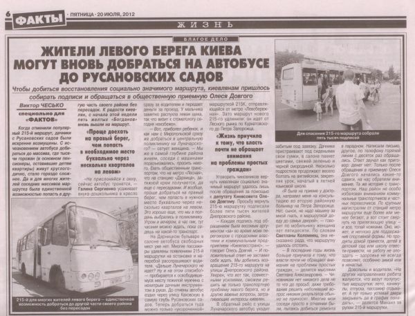 … а їхнім батькам, які мають у жовтні прийти на виборчі дільниці, теж пощастило – їм стало зручніше добиратися з Дніпровського району до Русанівських садів ("Факты" №128, від 20 липня 2012).