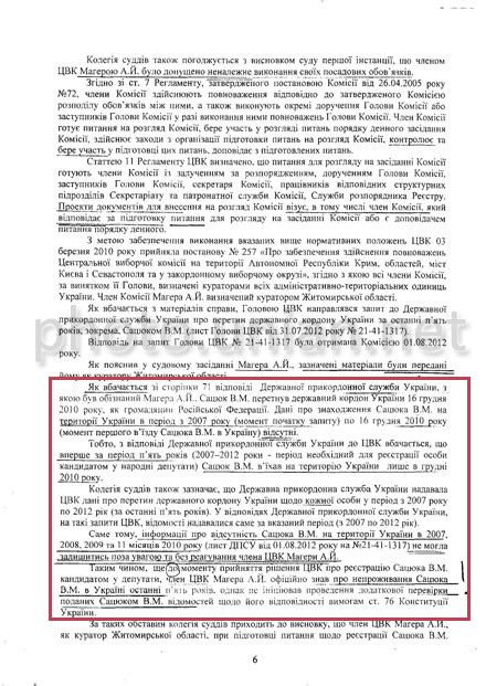 "Судом правильно встановлено, що в період з 3 березня 2005 року Сацюк жодного дня не знаходився на території України, є громадянином Російської Федерації, і лише в грудні 2010 року вперше перетнув кордон України як громадянин Російської Федерації. Перетинав кордон за 6 паспортами", - заявив суддя Кравцов.