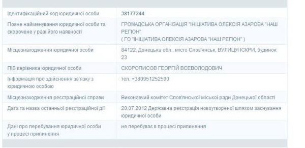 За даними Єдиного державного реєстру підприємств та організацій України, основну інформацію про які можна переглядати на сайт ДП "Інформаційно-ресурсний центр", громадська організація "Ініціатива Олексія Азарова "Наш регіон" була зареєстрована виконавчим комітетом Слов'янської міськради 20 липня 2012 року. В останніх реєстраційних діях зазначено: "Державна реєстрація новоутвореної шляхом заснування юридичної особи".