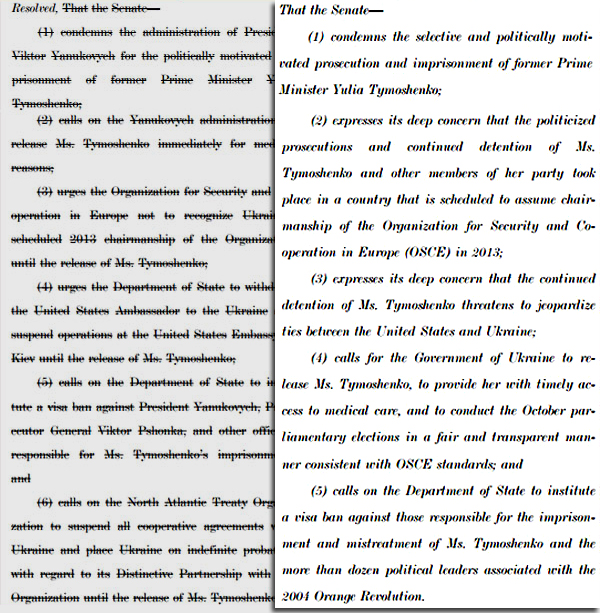 Правда, резолютивную часть документа сенатор Дурбин значительно смягчил. В ней не оказалось настоятельного требования от Госдепа отозвать посла и приостановить работу посольства США в Киеве. Кроме того, из требования ввести запрет на въезд в США были изъяты фамилии Януковича и Пшонки, но появилось упоминание обо всех, кто причастен к осуждению и неоказанию медицинской помощи Юлии Тимошенко.