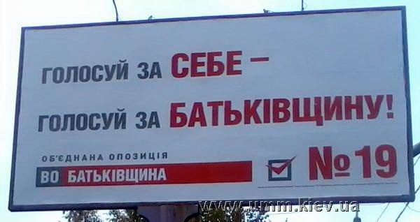 Останній сюжет – Голосуй за себе, голосуй за Батьківщину – примушує маркетологів кожного разу хапатися за пістолет: відсутність колективного начала, дуже важливого в політиці, солідаризму, перекидання відповідальності на виборців, відсутність проекту України, відсутність діалогу, а лише нав’язування моделі поведінки.