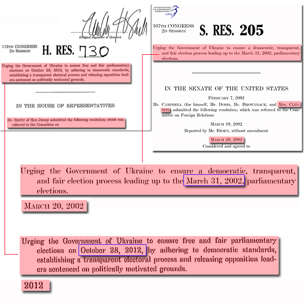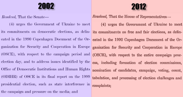 "Украинская правда" проанализировала все резолюции касательно парламентских выборов в Украине, и оказалось, что однажды документ подобного содержания уже был принят Конгрессом. Десять лет назад в марте 2002 года за десять дней до парламентских выборов в Украине Сенат США принял резолюцию, которая практически дословно повторяет формулировки готовящегося документа.