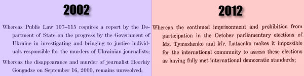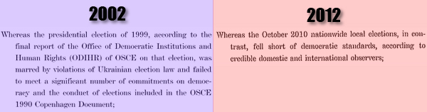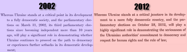 Как и в резолюции 2002 года, Конгресс США отмечает, что Украина снова оказалась в критической точке развития демократических институтов. Выборы 28 октября 2012 года – станут таким же показателем приверженности украинских властей основам демократии, как и выборы 26 марта 2002 года. С одним уточнением: в отличие от резолюции времен Леонида Кучмы Хельсинская комиссия США добавила еще и "соблюдение прав человека".
