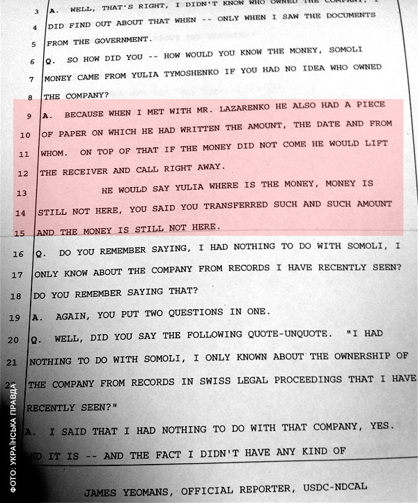 "Коли я зустрічався з Лазаренком, у нього був аркуш, на якому він писав суму, дату і від кого мали надійти кошти. Якщо гроші не приходили, він піднімав трубку і дзвонив. Він міг сказати: "Юля, де гроші, вони все ще не прийшли. Ти сказала, що перевела таку і таку суму, але гроші все ще не на рахунку".