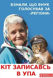 Фотожабники приміряли на кота різний одяг: упівський картуз: "Взнали, що внук голосував за "Регіони", кіт записався в УПА"; вбрання американського солдата з кулеметом у лапках: "Відмовляюся від бабиної хати. В мене дещо інші плани. На Міжгір’я!".