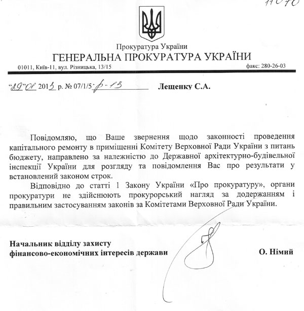 Водночас цікаво, як Генпрокуратура вийшла із ситуації. В порядку експерименту "Українська правда" надіслала звернення до Віктора Пшонки щодо капітального ремонту в кабінеті голови бюджетного комітету Гєллєра.