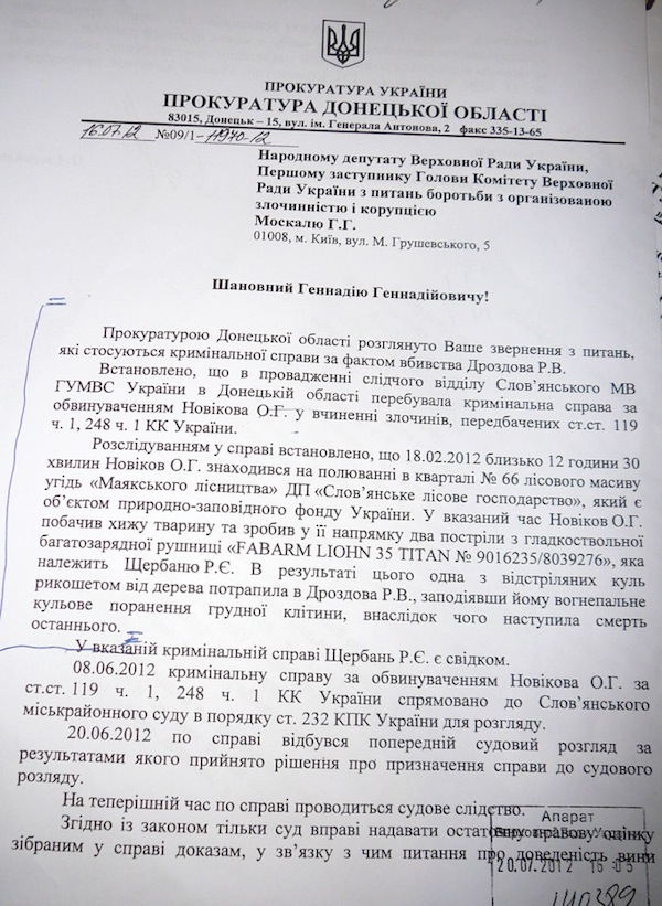 Хоча поговорити було про що. Адже, як бачимо, саме Руслан Щербань виявився тим самим власником бази, особою № 6 з вироку суду. До речі, пізніше автор отримав ще одне підтвердження, що особа №6 - це саме Руслан Щербань. Прокуратура Донецької області відписала Геннадію Москалю, що рушниця, з якої був застрелений Родіон Володимирович Дроздов, належить Щербаню Р.В.