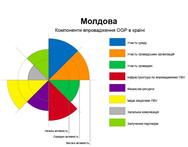 До уваги бралися 8 компонентів: активність уряду, участь неурядових організацій, участь громадян, інфраструктура для впровадження OGP, фінансові ресурси, імідж ініціативи, загальна комунікація та залучення партнерів. Лідерами переходу на сучасне урядування стали Грузія та Молдова. Результати усіх 6 країн представлені нижче.