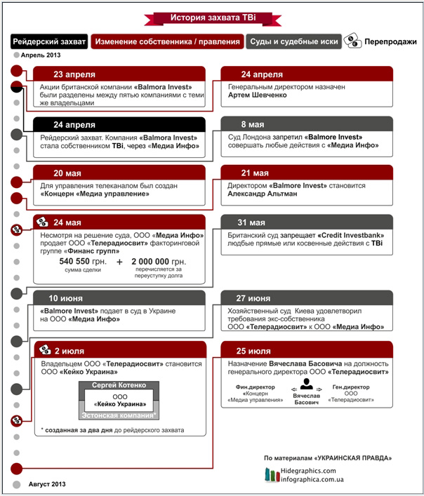 После рейдерского захвата 24 апреля 2013 года телеканал ТВі регулярно переходит из рук в руки. И руки эти каждый раз становятся все грязнее. Канал прошел смену менеджмента и структуры собственности, а также многократные "перепродажи" с целью вывести активы из-под судебного запрета.