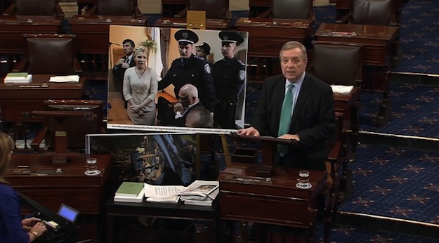 Виголошуючи промову, сенатор Дурбін поставив поряд із собою велику фотографію Тимошенко на фоні міліцейського конвою, зроблену в Печерському районному суді перед виголошенням вироку.