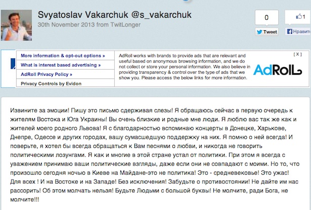 Подзвонили наші з #Євромайдан у #Київ, сазали, що там беркут б'є людей і розігнали майдан, багато поранених. Ми молимося, щоб усі вціліли.