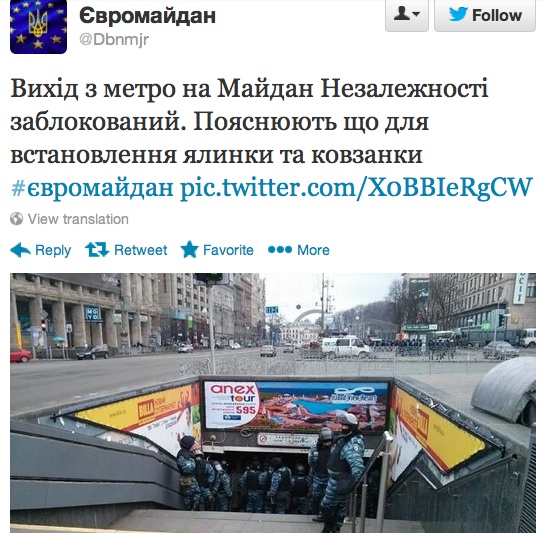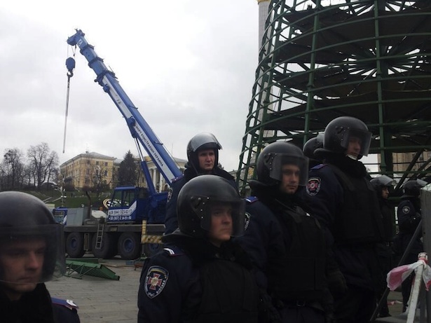 Майдан пуст, в оцеплении милиции. Не одна скорая уехала с побитыми людьми. Официальная версия: люди мешают собирать елку. #євромайдан