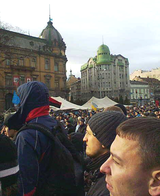 На Михайлівському кілька тисяч народу. Чекаємо лідерів. Повідомили, що створено Штаб Національного Спротиву. Люди аплодують львівському Беркуту, який відмовився іти з кийками проти людей. Студенти пишуть плакат. Машини гудять і сигналять. Це справжній всенародний спротив, який хунті вже не зупинити