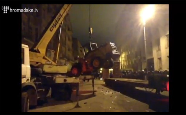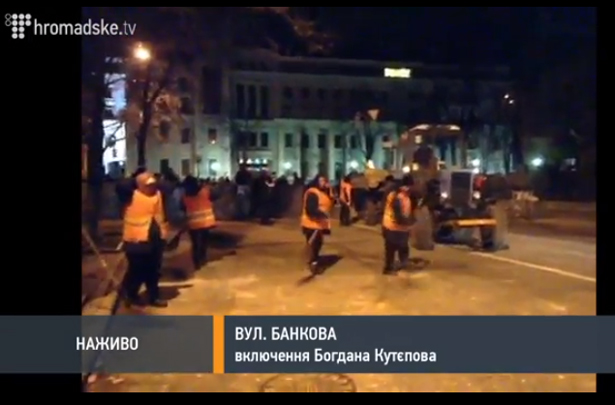 Біля Адміністрації президента величезна колона комунальної техніки перекрила Банкову на розі з Інститутською. Станом на 13:00 там страшенна метушня, сюди біжать працівники спецпідрозділів міліції. До них підбігають працівники внутрішніх військ в шоломах. Поряд близько кількох десятків протестувальників. Люди нагадують міліції про присягу, повдіомляє Громадське радіо.