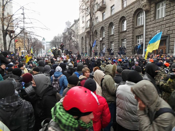 Під КМДА люди розбили киілька шибок, зайшли в КМДА, однак пізніше їх попросили виходити, щоб не зганьбити акцію, бо це не по-євромайськи. Всередині бійці Титану. Плопросили створити периметр і не пускати людей. Міліція станом на 13:17 барикадуються.