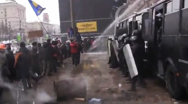 2:02 "Беркут" заблокував Майдан з боку Інститутської. Таким чином люди не можуть піти від сцени до Будинку профспілок. Священник зі сцени молитву.