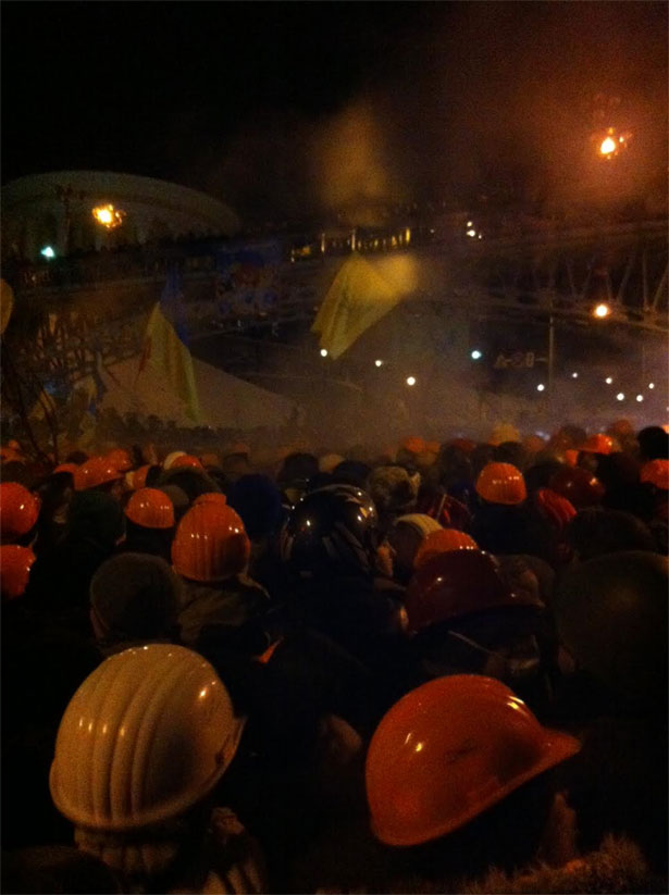 Міліція застосовує сльозогінний газ на Інститутській, намагаючись відтиснути мітингувальників вниз на Майдан. Це протистояння продовжується вже приблизно 2 годин. Люди продовжують тримати оборону потроху спускаючись вниз. З натовпу медики винесли на носилках одного "беркутівця".