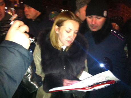 1:25 На сходах КМДА зібралося близько 200 людей. На площі перед міськрадою скопичилося близько 100 осіб, які оточили міліцію. Судовий виконавець Лариса Сабодаш зачитує ухвалу Печерського райсуду про вжиття заходів у справі щодо блокування тротуарів, доріг, шляхом розміщення на них різних предметів.