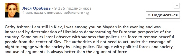 Представництво ЄС в Україні зараз намагається зв'язатися з компетентними та відповідальними особами з правоохоронних органів, щоб НЕ ДОПУСТИТИ застосування сили проти звичайних громадян. Ми захоплюємося мирною рішучістю та спокоєм демонстрантів на Майдан