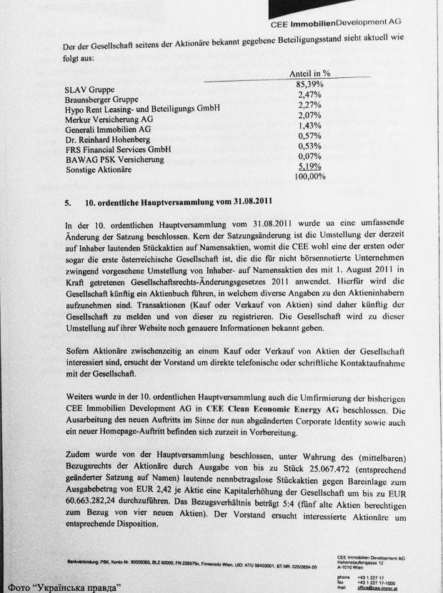 Насправді це не так, як випливає з ще одного документу, що потрапив у розпорядження "Української правди". Фірмою CEE Clean Economic Energy AG на 85 відсотків володіють підприємства створеної Клюєвими у Австрії групи "Slav", яку вони акціонували, але продовжують володіти контрольним пакетом статутного капіталу.