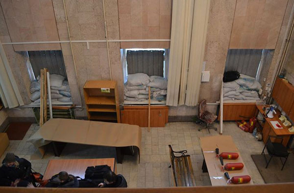 Усередині - десятки працівників міліції, невідомі характерної зовнішності - добровольці та дружинники, що "відгукнулися на заклик облдержадміністрації допомогти захистити правопорядок".