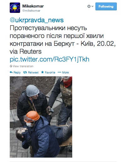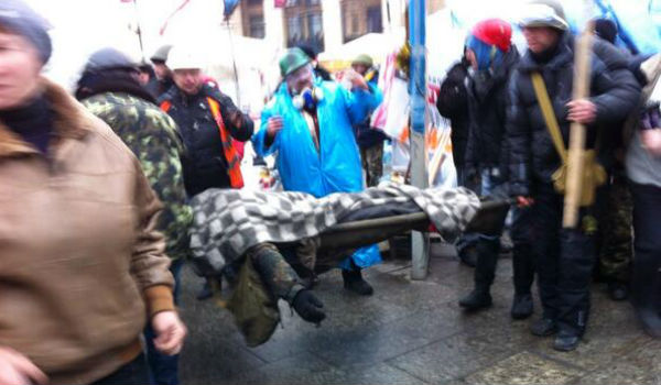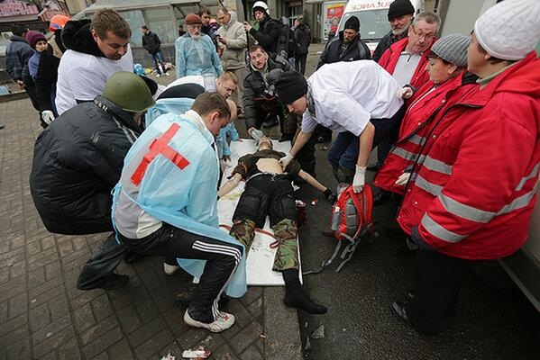 Друзі в районі готелю Україна працює снайпер. Будьте уважні! В нас уже десятки поранених та, на жаль, 3 загиблих. Прохання до всіх попросіть, щоб карети швидкої під'їхали максимально близько до готелю "Україна" - потрібно вивозити поранених.