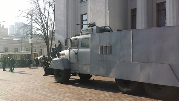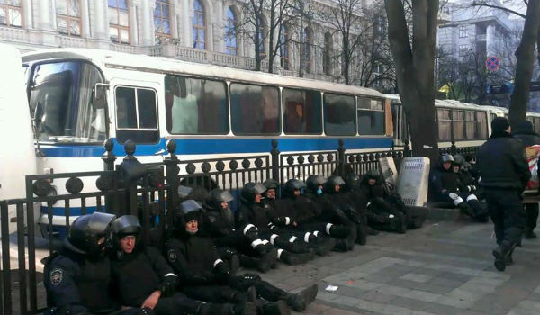 По Институтской улице со стороны м Арсенальная к Верховной раде подходит подкрепление спецназа со щитами. Проход к Раде перекрыт блоками