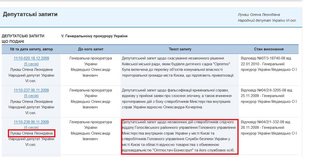 6 листопада 2009 року Лукаш звернулася до МВС та СБУ із запитом щодо незаконних дій співробітників цих відомств відносно ТОВ "Оптпостач-Бізнесгруп". Ця фірма займалася продажем металоконструкцій та металевих труб.