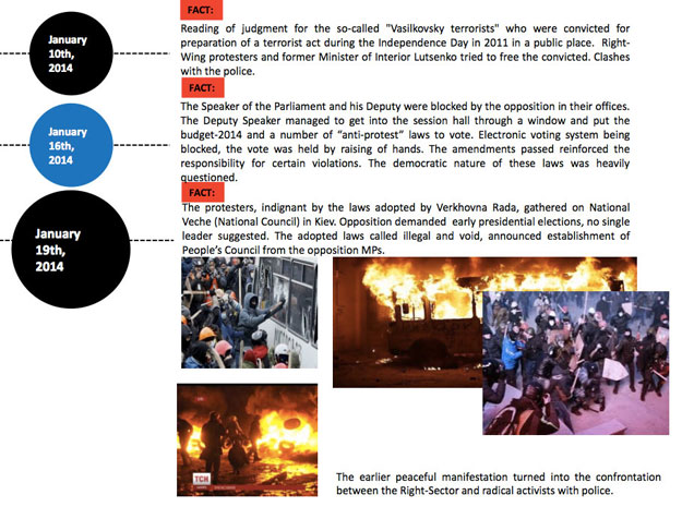 Наприклад, ось перед вами слайд з останньої презентації цього центру. Тут описано події навколо голосування диктаторських законів 16 січня. В бюлетені для західної аудиторії починають опис ситуацію з того, що спікер і його заступник були заблоковані опозицією в своїх офісах (без пояснення причин – чому). "Віце-спікер, щоб потрипити до зали засідань, виліз через вікно та поставив на голосуваня бюджет та низку "анти-протестних" законів (насправді законами запроваджувалася диктатура, а його поширення виходило далеко за межі протестів - УП). Поправки посилювали відповідальність за певні порушення. Демократичний характер цих законів був під сильним сумнівом", - ось і все. Потім написано, що опозиція зажадала дострокових виборів, але не висунула єдиного кандидата – хоча і не повинна була, оскільки вибори так і не призначено. Подібними пересмикуваннями наповнена вся продукція, яку готує згаданий центр.