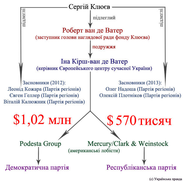 Також минулого року Клюєв двічі, у травні та червні, відвідав Вашингтон. На зустрічах в американській столиці Клюєва супроводжував керівник лобістської фірми Mercury/Clark & Weinstock Ед Катлер (Ed Kutler). "Українська правда" звернулася до нього з проханням повідомити, в якій якості він був присутній разом з Клюєвим. Катлер не заперечив цих контактів, натомість переадресувавши до "Європейського центру сучасної України". "Ми працюємо з ними", - відповів Катлер. Тобто, з його слів випливало, що ця брюссельська контора виступала посередником не лише для переказу грошей регіоналів у Америку, але і для надання Клюєву допомоги з боку лобістів у Вашингтоні.