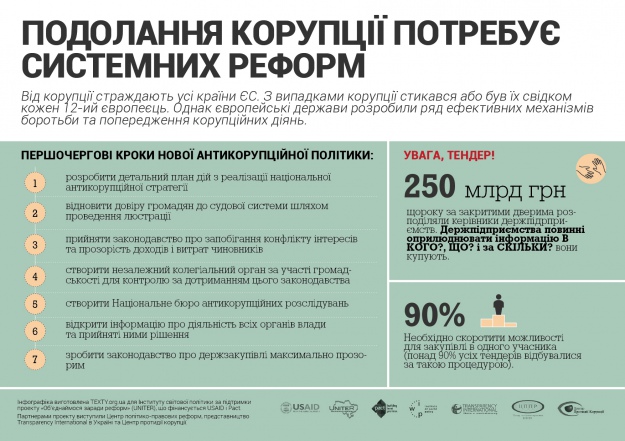 У представленій інфографіці експерти ІСП підсумували напрацювання експертної спільноти в сфері запобігання й протидії корупції та доповнили їх історіями успіху країн Євросоюзу. Це ті кроки, які необхідно зробити українській владі, щоб урешті-решт перейти від декларацій до реальних дій у сфері боротьби з корупцією.