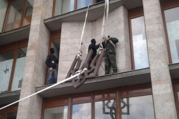 | 15 апреля с фасада Донецкой ОГА сняли герб Украины. Фото hromadske.tv |