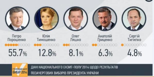 Кандидат у президенти Петро Порошенко набрав понад 54% голосів виборців за результатами обробки 40% протоколів у електронному вигляді.