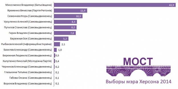 У Херсоні за результатами екзіт-пола перемогу на виборах мера одержав Володимир Миколаєнко – представник "Батьківщини" з результатом 43,9%.