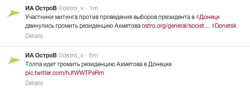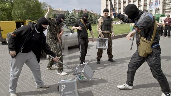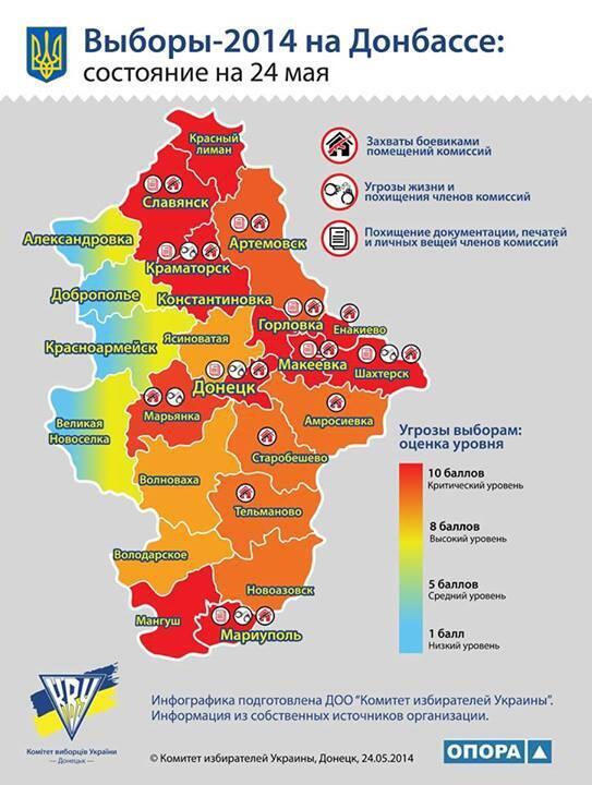 У тому ж Донецьку в неділю в районі Міжнародного аеропорту ім. Прокоф'єва терористами було скоєно напад на кілька машин, які перевозили бюлетені для президентських виборів.